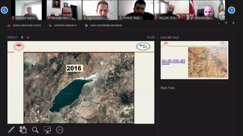 Yeni tip koronavirüs (Kovid-19) salgını tedbirleri kapsamında çevrim içi iki oturumda gerçekleştirilen toplantıda, DSİ 18. Bölge Müdürü Rahmi Şahin, Burdur Gölü'nün son 60 yılını anlatan sunum yaptı.