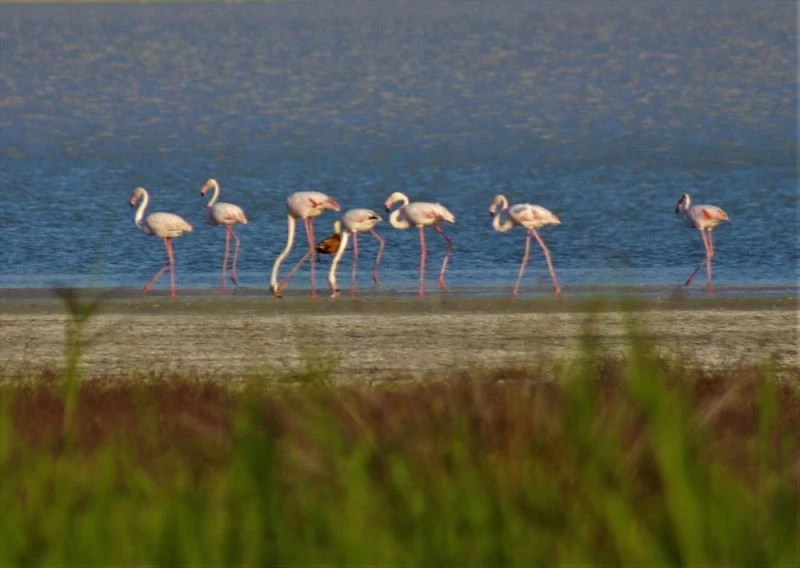 Bu yil yagislarla su miktari artan gölde çok sayida flamingo geldi.