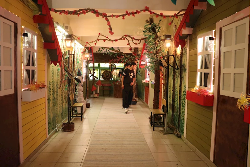 Resim Öğretmeni Özlem Dolunay öncülüğünde oluşturulan koridorda, karton kağıtlar, deterjan kutuları, atık plastikler, çöp poşeti, kumaş ve sünger parçaları gibi geri dönüştürülebilir malzemelerle yapılan geyik, köpek, kertenkele, ağaç, insan figürleri, sokak lambaları gibi tasarımlar sergilendi.