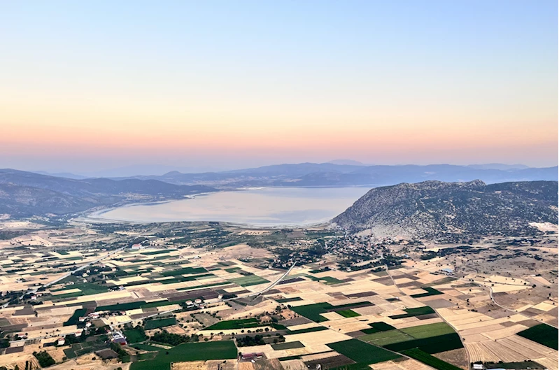 Gökyüzünde peşi sıra yükselen rengarenk sıcak hava balonlarına binerek tura katılanlar, güneşin doğuşunda ortaya çıkan güzel manzara eşliğinde Salda Gölü üzerinde süzülüyor.