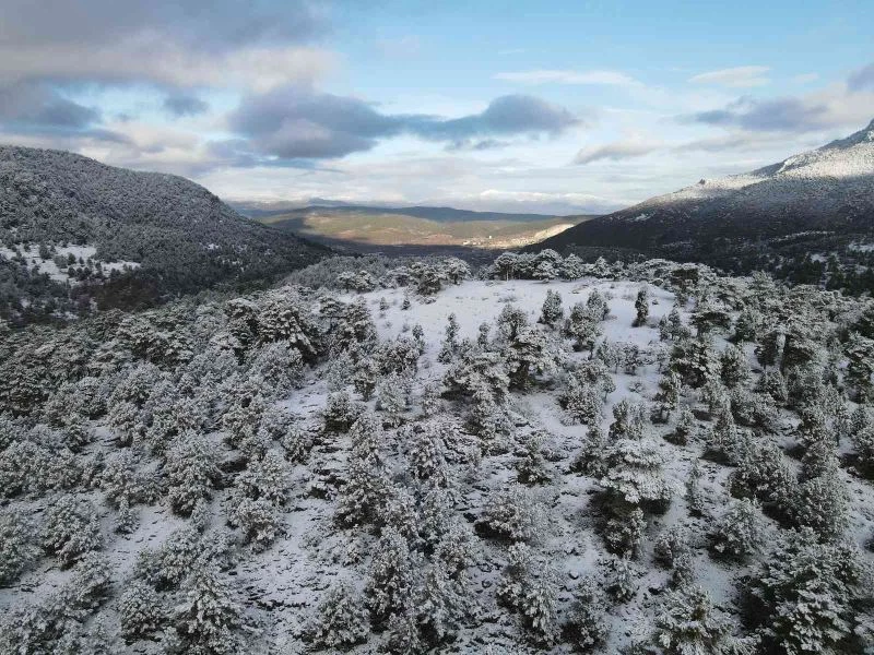 Burdur’un 1238 rakıma sahip Altınyayla ilçesi kar yağışının ardından beyaz örtüyle kaplandı. Yeşil ağaçların kar beyaz ile bütünleşmesi ise doğaseverler tarafından drone ile kayda alındı. Eşsiz manzara ise görenleri kendine hayran bıraktırdı.