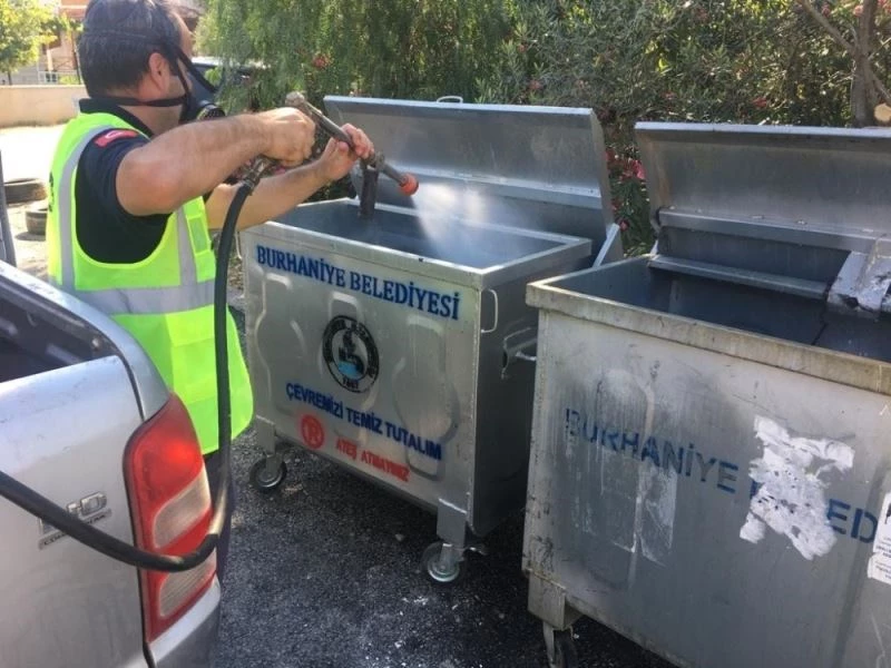 Burhaniye Belediyesi, karasinek ve uçkunlara yönelik çöp konteynırlarını temizleyerek ilaçlamalarını yapıyor. Yapılan çalışmayla sinek larvaları yok edilerek üremeleri önleniyor.