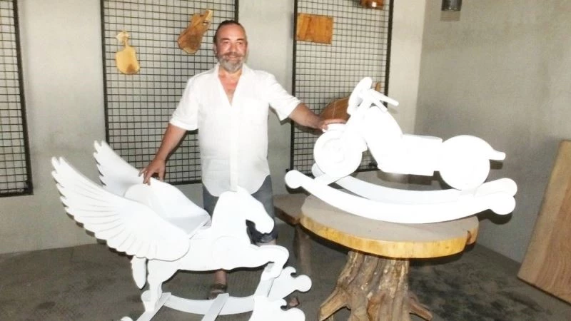 Burhaniye’de Cumhurbaşkanı Recep Tayyip Erdoğan’a hediye ettiği altın kaplama Kanuni kılıcı ile adını duyuran Muammer Tural, çocukları sağlıksız oyuncaklardan kurtarmak için kolları sıvadı. Ahşaptan çeşit çeşit oyuncaklar yapan 54 yaşındaki Tural, “30 yıldır makine imalatı yapıyorum. Son zamanlarda imal ettiğim altın kaplama Osmanlı kılıçlarını Cumhurbaşkanı Recep Tayyip Erdoğan başta olmak üzere devlet büyüklerine hediye ettim. Şimdi de pandemi nedeniyle çocukları sağlığa zararlı oyuncaklardan kurtarmak için ahşaptan oyuncaklar yapmaya başladım. Bunların başında da Adramytteion antik kentinin simgesi olan Pegasus atı var. Piyasada sağlığa zararlı oyuncaklar var. Hazırladığım oyuncaklara velilerden, anaokullarından, otellerden ve büyük lokantalardan talep var. Oyuncakların tanesini 150 ile 500 lira arasında satıyorum” dedi.