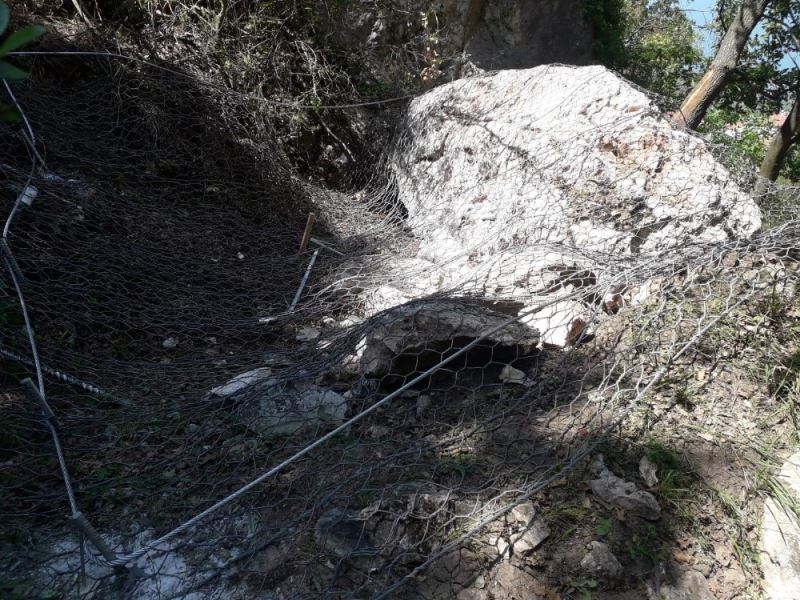 Bursa’nın İznik ilçesi Mustafalı Mahallesi’nde düşme tehlikesi bulunan dev kaya için önlem alındı. Yaklaşık 50 tonluk kaya çelik tellerle sarıldı.