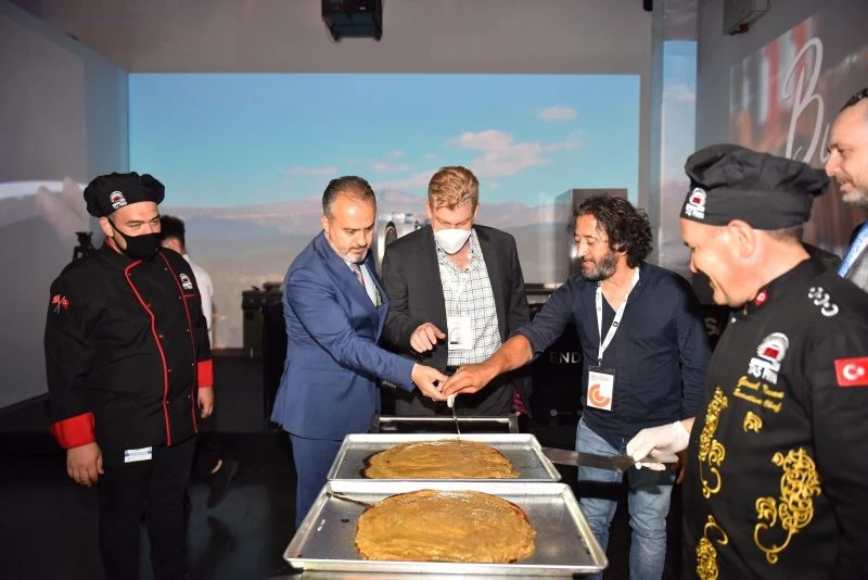 Bursa’nın turizmden daha fazla pay alabilmesi için şehrin sahip olduğu değerleri ulusal ve uluslararası arenada tanıtmak için yoğun çaba harcayan Bursa Büyükşehir Belediyesi, bu kez kentin mutfak kültürünü İstanbul’da tanıttı. İstanbul Kongre Merkezi’nde düzenlenen Gastronomi Turizm Fuarı & Konferansı ‘Gastro Show’da Bursa’nın gastronomi değerlerini yerli ve yabancı misafirlere anlatan Büyükşehir Belediyesi, akşam düzenlenen yemekte de Bursa lezzetlerini davetlilere ikram etti. Bursa’nın eşsiz lezzetleri İnegöl köfte, kestane şekeri, Gedelek turşusu, Bağdat hurma tatlısı, Bursasu, süt helvası, Mustafakemalpaşa tatlısı, tahinli pide, Bursa kebabı, pideli köfte ve Uludağ gazoz, dâvetlilerden tam not aldı.