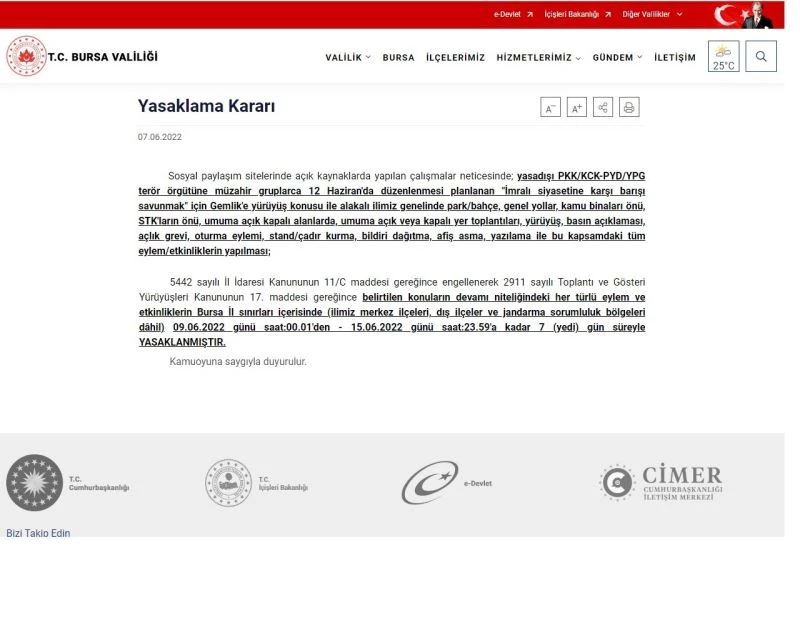"Sosyal paylaşım sitelerinde açık kaynaklarda yapılan çalışmalar neticesinde; yasa dışı PKK/KCK-PYD/YPG terör örgütüne müzahir gruplarca 12 Haziran’da düzenlenmesi planlanan ’İmralı siyasetine karşı barışı savunmak’ için Gemlik’e yürüyüş konusu ile alakalı ilimiz genelinde park/bahçe, genel yollar, kamu binaları önü, STK’ların önü, umuma açık kapalı alanlarda, umuma açık veya kapalı yer toplantıları, yürüyüş, basın açıklaması, açlık grevi, oturma eylemi, stant/çadır kurma, bildiri dağıtma, afiş asma, yazılama ile bu kapsamdaki tüm eylem/etkinliklerin yapılması; 5442 sayılı İl İdaresi Kanununun 11/C maddesi gereğince engellenerek 2911 sayılı Toplantı ve Gösteri Yürüyüşleri Kanununun 17. maddesi gereğince belirtilen konuların devamı niteliğindeki her türlü eylem ve etkinliklerin Bursa il sınırları içerisinde (İlimiz merkez ilçeleri, dış ilçeler ve jandarma sorumluluk bölgeleri dahil) 09.06.2022 günü saat 00.01’den - 15.06.2022 günü saat 23.59’a kadar 7 gün süreyle yasaklanmıştır."