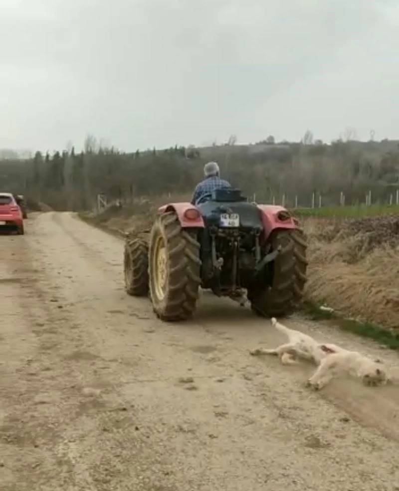 Bursa’nın İnegöl ilçesi kırsal Şehitler Mahallesinde meydana gelen olayda Rauf Halil B.(60), tavuklarını yediğini iddia ettiği hamile olan köpeği av tüfeği öldürüp, traktörünün arkasına bağladığı iple sürükledi. O anlar amatör kameraya yansıdı.