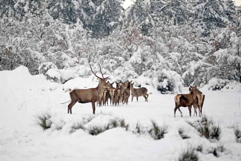 Bursa’da doğaya salınmak üzere Uludağ Üniversitesi Kızıl Geyik Yetiştirme Merkezi’nde yetiştirilen geyiklerin kan değiştirme programları kapsamında sağlıklı çoğalmaları sağlanıyor. Yoğun kar yağışının ardından Milli Park görevlileri tarafından beslenen kızıl geyiklerin karla kaplı ormandaki renkli görüntüleri drone ile görüntülendi.