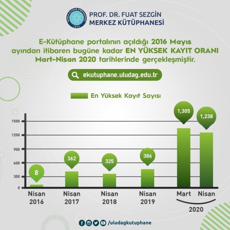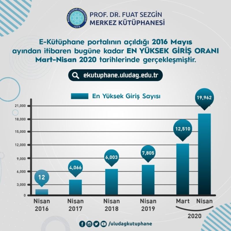 BUÜ Kütüphane ve Dokümantasyon Daire Başkanlığı tarafından abone olunarak öğrenci ve akademisyenlerin hizmetine sunulan, elektronik kaynaklara (e-dergi, e-kitap, e-tez vb.) uzaktan erişim için sunulan e-kütüphane web portalı salgın sürecinde kullanım rekoru kırdı. Üniversite tarafından 2016 yılında hizmete açılan http://ekutuphane.uludag.edu.tr kampüs dışı erişim sistemi, birebir eğitimlerin sonlandırılmasının ardından mart ve nisan aylarında en yüksek kullanım oranlarına ulaştı. Eğitim-öğretimin uzaktan devam ettirilmesi nedeniyle uygulamaya alınan kampüs dışı erişim sistemi sayesinde BUÜ’lü öğrenci ve akademisyenler evlerinden e-kaynaklara hızlı ve kolay bir şekilde ulaşabildiler. Salgın öncesinde de yoğun olarak kullanılan platform eğitime ara verilen dönemde de kesintisiz hizmet vermeye devam etti.