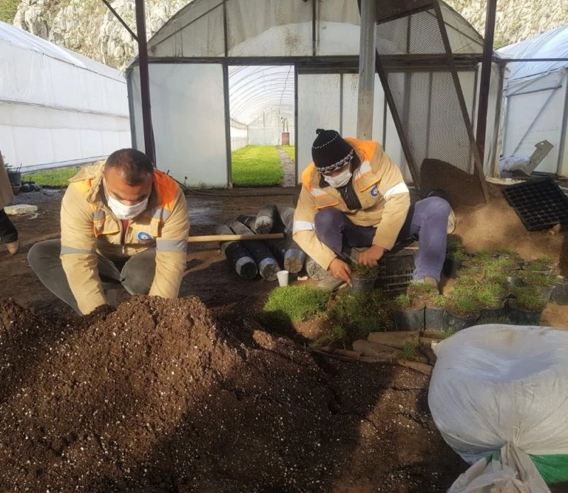 Antalya Büyükşehir Belediyesi Hurma Üretim Tesisi’nde ihtiyacı olan çim fidelerini kendi üreterek tasarruf ediyor. Susuz koşullara dayanıklı Zoysia ve St. Augustine türü çim fidesi üretimi ile su tüketiminin de en aza indirilmesi hedefleniyor.