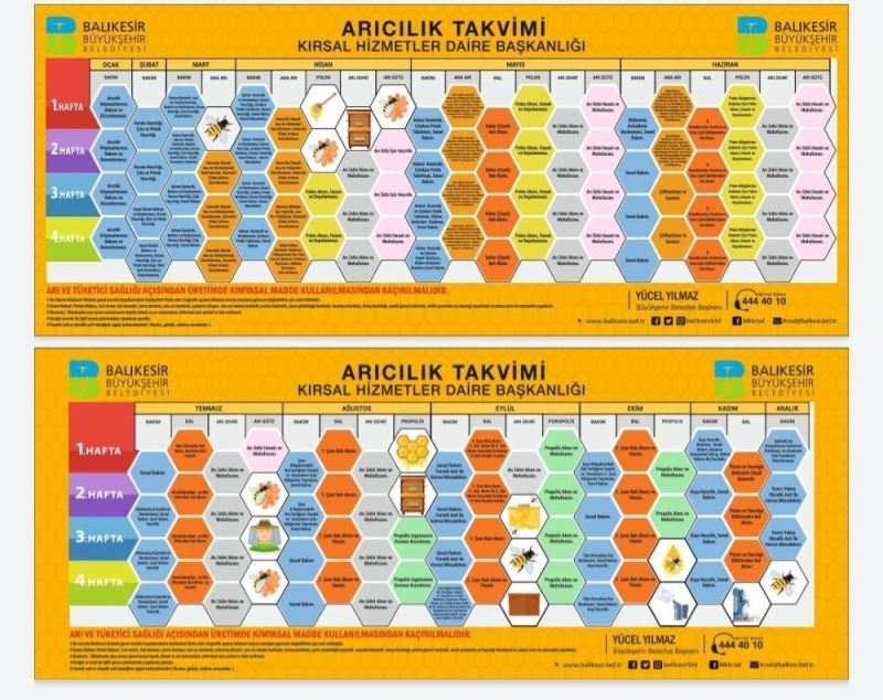 Kırsalda istihdam alanlarını büyütmeyi ve üreticilere ek gelir sağlamayı hedefleyen Balıkesir Büyükşehir Belediyesi, arıcılık faaliyetlerinin daha ekonomik, bilinçli ve bilimsel yapılabilmesi amacıyla Balıkesirli arıcılara özgü arıcılık takvimi hazırlattı.