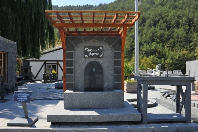 Vefat etmiş yakınlarının hayrına çeşme yaptırmak isteyen vatandaşlara da hizmet veren tesis, özel tasarımlarla hayrat çeşmeleri üretiyor. Yaklaşık 2 ton ağırlığındaki çeşmeler, adreslerine teslim edip montajı yapılıyor. En çok ilgiyi ise ismini tesis bahçesine dikilen asma bitkisinden alan ‘asmalı çeşme’ görüyor. Ahşapla da kombine edilen çeşmenin arkasında ise geniş hacimli saksı buluyor.