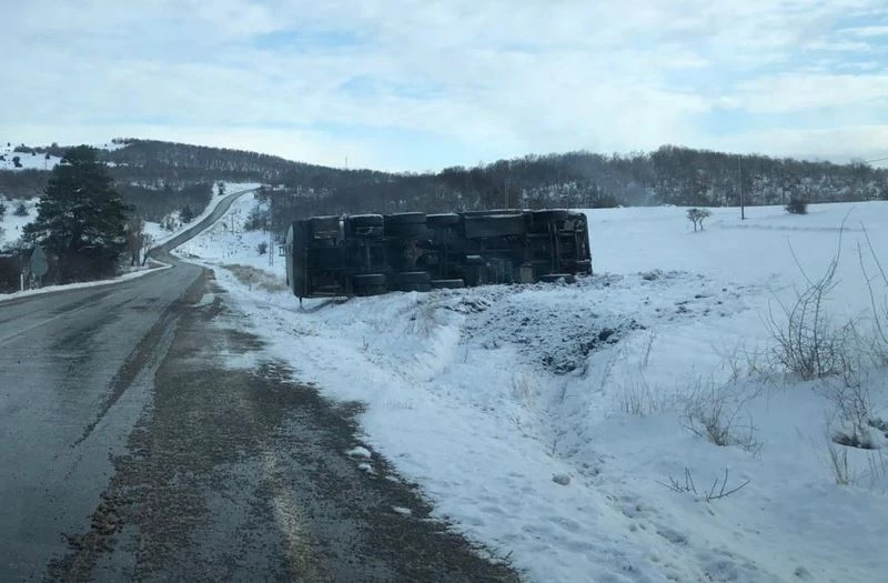 Bilecik’te seyir halindeyken yolun buzlu olması sebebiyle kontrolden çıkan tanker devrildi, sürücüsü yaralandı.