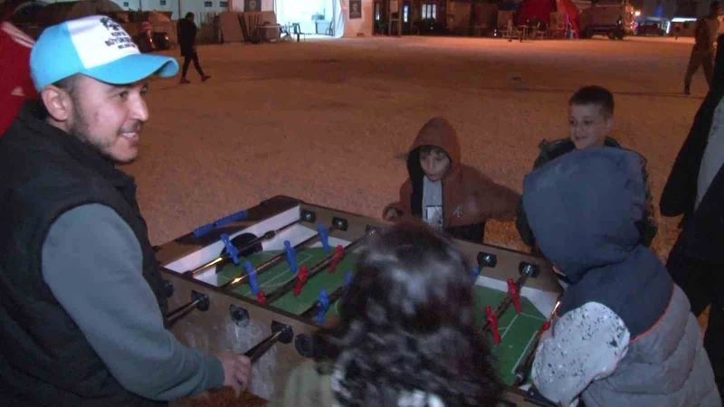 Deprem felaketinin ardından Hatay’da kurulan çadır kentlerde kalan çocuklar akşamları da futbol, langırt, sinema, oyun parkı gibi alanlarda eğlenceli vakit geçiriyor.
