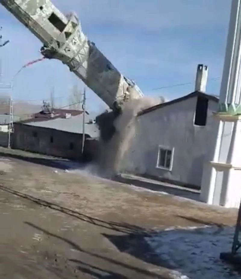 Sivas merkeze bağlı Hasbey köyünde devrilme tehlikesi bulunan cami minaresi Sivas Belediyesi ekiplerince kontrollü bir şekilde yıkıldı, o anlar cep telefonu kamerası ile kaydedildi.