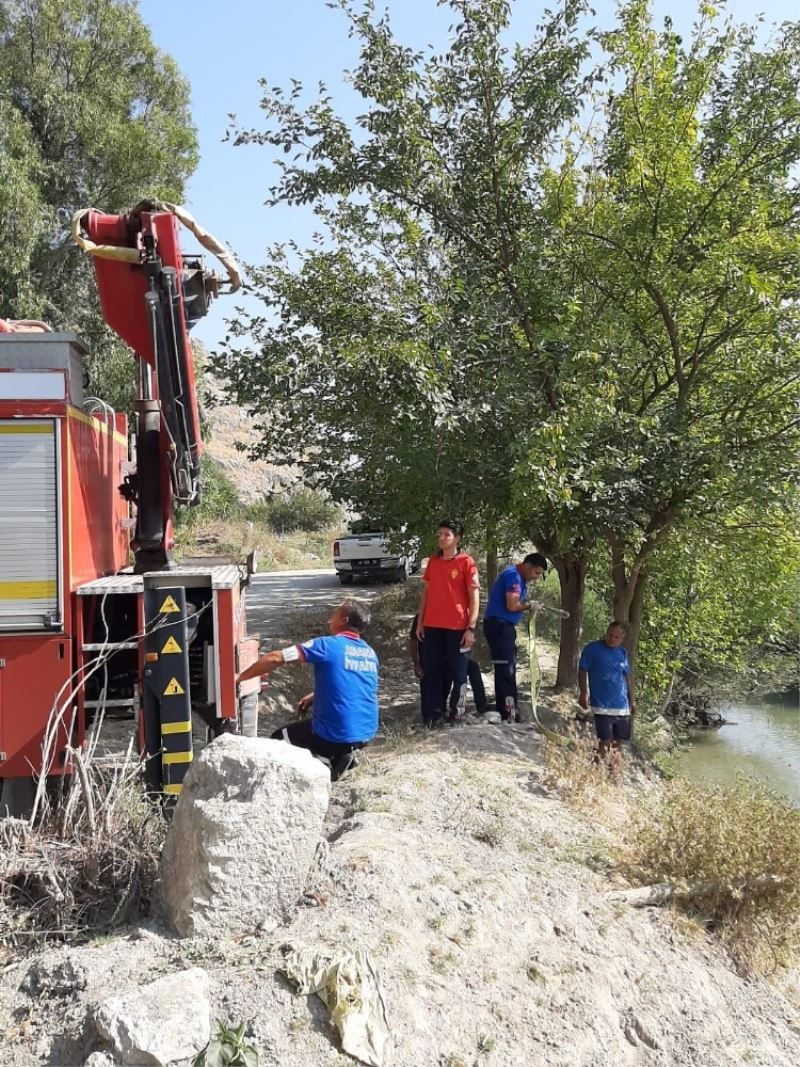 Edinilen bilgiye göre, ilçeye bağlı Dilekkaya Mahallesi’nde Hüseyin Sürer’e ait inek, su içmek için indiği dereden çıkamayıp mahsur kalarak çamura saplandı. İnek sahibi Sürer, kendi çabasıyla ineğini dereden kurtaramayınca itfaiye ekiplerine durumu haber verdi. Olay yerine gelen itfaiye ekipleri, ineği çıkarmak için olay yerine vinç çağırdı. Vinç yardımıyla kurtarılan inek, sahibine teslim edildi.