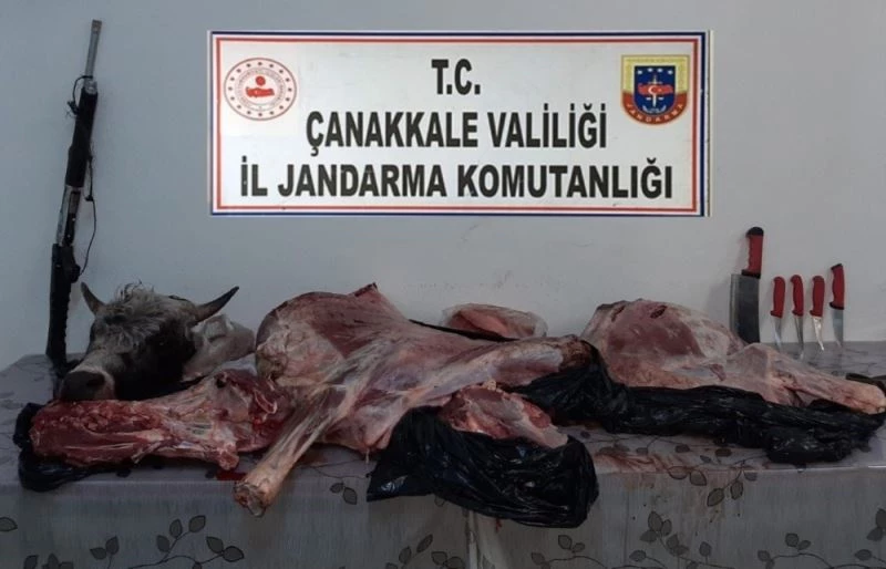 Çanakkale İl Jandarma Komutanlığı ekiplerince yapılan araştırmada S.A. ve E.K. isimli şahısların arazide başıboş gezen büyük ve küçükbaş hayvanları av tüfeği ile vurmak suretiyle çaldıklarının tespit edilmesi sonucu yapılan çalışmayla jandarma ekipleri S.A. ve E.K.’yi suçüstü yakaladı. Şahıslara ait traktörde yapılan aramada; 1 adet başından ateşli silah ile vurulmuş ve parçalanmış halde büyükbaş hayvan, 1 adet ruhsatsız pompalı av tüfeği, 1 adet av tüfeğine ait tek kurşun fişek, 1 adet boş fişek (Kartuş), 1 adet satır, 4 adet farklı ebatlarda bıçak ele geçirildi. Jandarmanın çalışması neticesinde büyükbaş hayvanın sahibi tespit edilerek, şüpheli iki şahıs hakkında adli işlem başlatıldı.