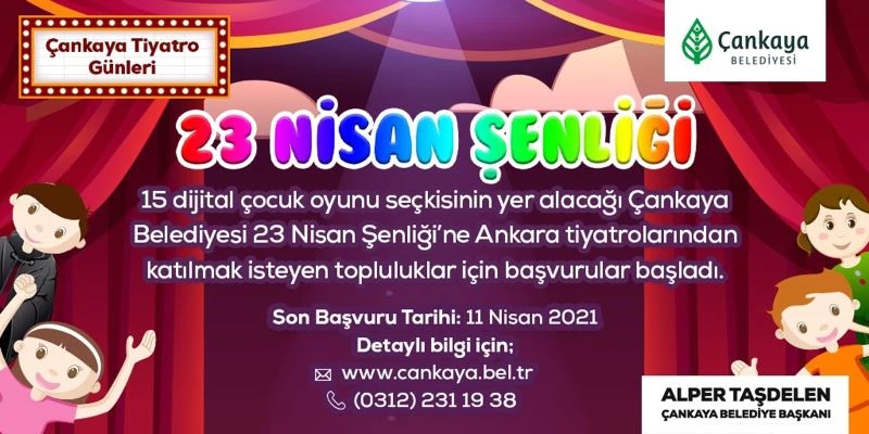 23 Nisan Şenliği’nde önceden kayıt altına alınmış çocuk oyunlarının yer alması isteyen tüm sanatçı ve tiyatro grupları başvurularını 11 Nisan tarihine kadar, tiyatrogunleri@cankaya.bel.tr adresine yapabilecek. Başvurmak isteyenler ayrıntılı bilgiye, Çankaya Belediyesi internet sayfasından ulaşabilir.