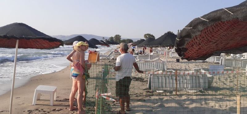 Kuşadası sahil sitelerinde bulunan plaja çıkan bir deniz kaplumbağası, şezlongların arasına yuva yaparak yumurtalarını bıraktı. Kaplumbağanın yuva alanı koruma altına alındı.