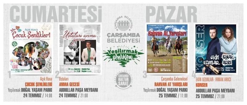 “Geleneksel Yeşilırmak Şenlikleri” 24 Temmuz Cumartesi günü saat 14.00’te, Yeşilırmak Doğal Yaşam Parkı’nda “Açık Hava Çocuk Şenlikleri” ile başlayacak. Program, 24 Temmuz akşamı 21.00’de Çarşambalı usta sanatçıları anmak adına, Abdullah Paşa Meydanı’nda gerçekleşecek Mahir Işıtan ve Hüseyin Şimşek konserleri ile devam edecek. Yeşilırmak Şenlikleri kapsamında 25 Temmuz Pazar günü saat 11.00’de “Geleneksel Rahvan At Yarışları”, akşamı 21.00’de ise Ekin Uzunlar ve Irmak Arıcı konseri vatandaşlarla buluşacak.