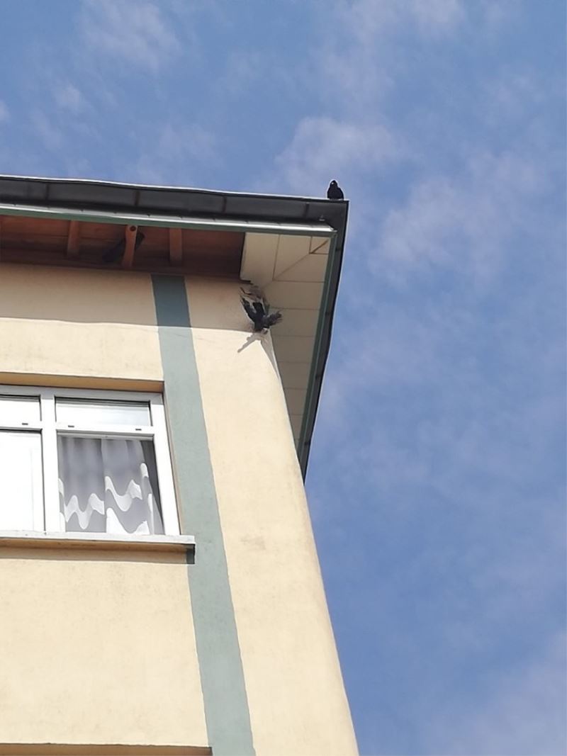 Çatıda mahsur kalan kargayı itfaiye ekipleri kurtardı