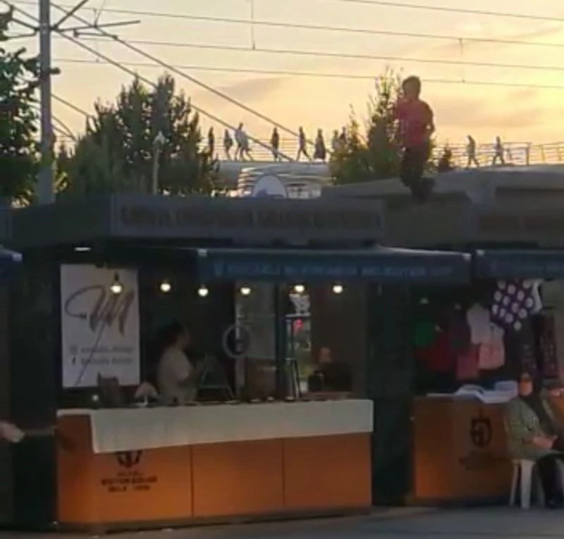 Kocaeli’de stantların çatısında zıplayan çocuklar, stant önünde oturan vatandaşları korkuttu.