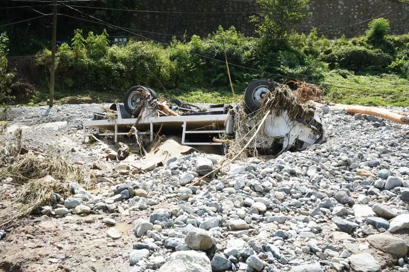 Rize’nin Güneysu ilçesinde şiddetli yağışların neden olduğu heyelan felaketinin boyutu gün ağarınca ortaya çıktı. Şiddetli yağışlarla beraber akan dereler tüp deposunu ve park halinde bulunan tüp dolu kamyonu sürükledi. Dere sularıyla beraber kaybolan tüpler gün aydınlanınca çay tarlasından ortaya çıktı.