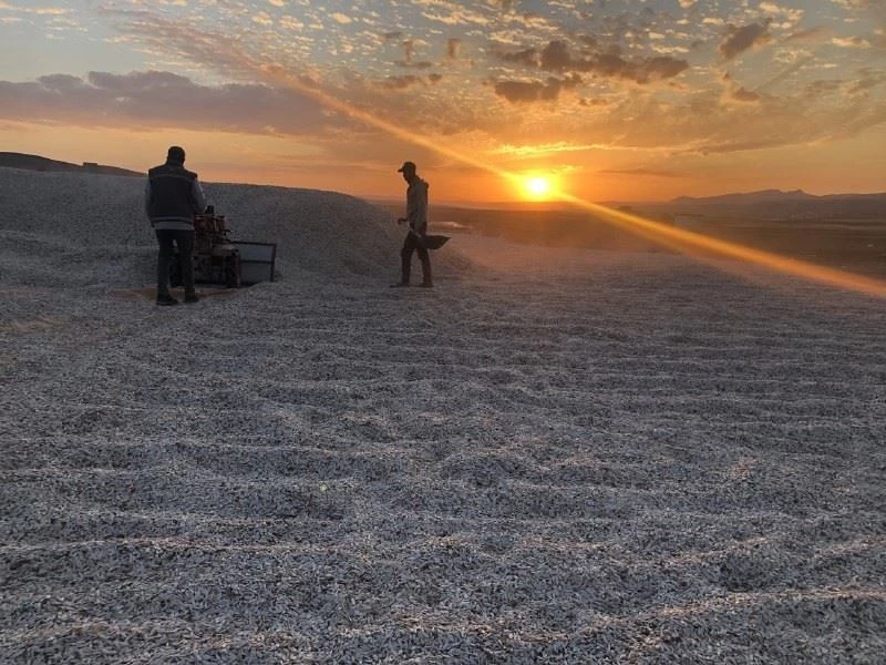 Çekirdek üreticisi Ramazan Bağrıaçık, Sivas’ın Altınyayla ilçesinde bin 900 dönüm alanda yetiştirdiği günebakanlar ile 150 ton çekirdek elde etti. Düz bir araziye serilerek kurumaya bırakılan çekirdekler, günbatımı ile kartpostallık görüntüler oluşturdu. Beyaz çekirdeklerin üzerinde kırılan güneş ışıkları görülmeye değer bir manzara sundu.