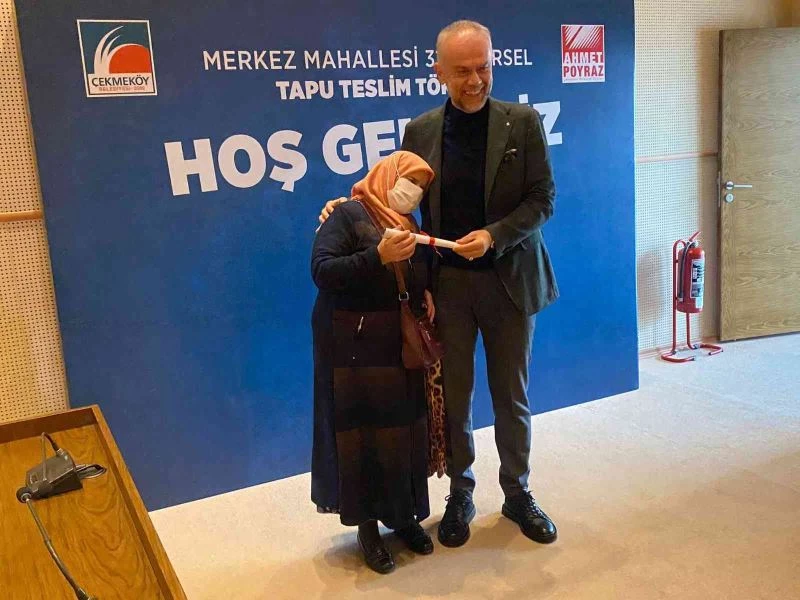 Çekmeköy’de Merkez Mahallesi’nde bulunan eski 3 bin 157 numaralı parselin ifrazı gerçekleştirilerek; 4 bin 72, 4 bin 105, 4 bin 107, 4 bin 108 ve 4 bin 110 parsellere ayrıldı. Milli Emlak’tan 4706 sayılı yasa gereğince bu parseller talep edildi. Talebe istinaden bu 5 parselin Çekmeköy Belediyesi adına tescili gerçekleştirildi. 2021 yılında hak sahipleri belirlenerek, Kadastro ve Tapu Müdürlüğünde yapılan çalışmalar neticesinde işlemleri tamamlanan tapular ailelere verilmeye başlandı. Çekmeköy Belediyesi’nin yaptığı titiz çalışmalar sonucunda mülkiyet sorunu çözülen aileler tapularını Çekmeköy Belediye Başkanı Ahmet Poyraz’ın elinden aldı.