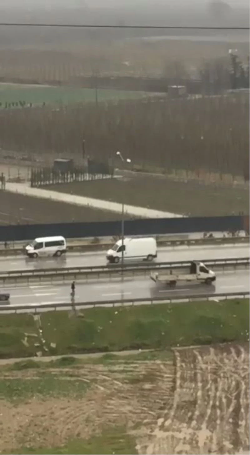 Bursa’da bir kişi çevre yolunda orta şeritte metrelerce yürüdü. Yanından geçen kamyon ve otomobillere aldırış etmeyip tehlike saçtı.