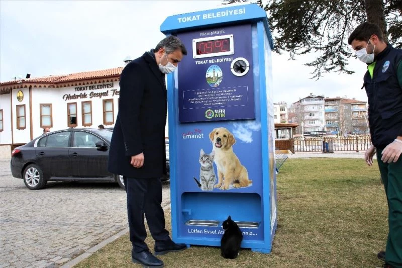 Tokat Belediyesi Veteriner İşleri Müdürlüğü sokakta yaşamını sürdüren kedi ve köpeklerin rahat bir şekilde mama ve su ihtiyaçlarını giderebilmeleri için şehrin farklı noktalarına "Mamamatik" cihazları yerleştirdi. Plastik ve cam içecek ambalajlarının giriş haznesine yerleştirilmesi ile işleyen mamamatik ile hem geri dönüşüme katkı sağlanıyor, hem de sokak hayvanları besleniyor. Tokat Belediye Başkanı Eyüp Eroğlu, hayvan dostu Tokat’ta yeni bir çalışmayı gerçekleştirmenin sevincini yaşadıklarını belirterek, “Bu geri dönüşüm sayesinde; kedilerimizin, köpeklerimizin mama ihtiyaçlarını gidermiş oluyoruz. Yapılması gereken şey çok basit, bir içecek içtiğimizde boş şişesini; mamamatiğimize atıyoruz ve yem haznesine mama dökülmesini sağlıyoruz. Ayrı zamanda da, su haznesinden su takviyesi de yapabiliyoruz. Sonuçta, sokaktaki kedilerimiz, köpeklerimiz buradan istifade etmiş oluyor. Köpekler, kediler ve tüm hayvanlar; Allah’ın bize emaneti. Onlar, bizim dostlarımız. Bu noktada bize düşen görev de her zaman onlara sahip çıkmak ve onlara her türlü imkanı sağlamaktır. Biz Tokat Belediyesi olarak kurumsal bir şekilde bunu çok önemsiyoruz. Her zaman, sokaktaki canlarımızın dostuyuz ve yanlarındayız. Gerek barınak içinde, gerek barınak dışında veya siz değerli vatandaşlarımızdan gelen talepler doğrultusunda; her türlü tedavilerini, bakımlarını, iaşelerini ve beslenmelerini de ayrıca önemsiyoruz” dedi.