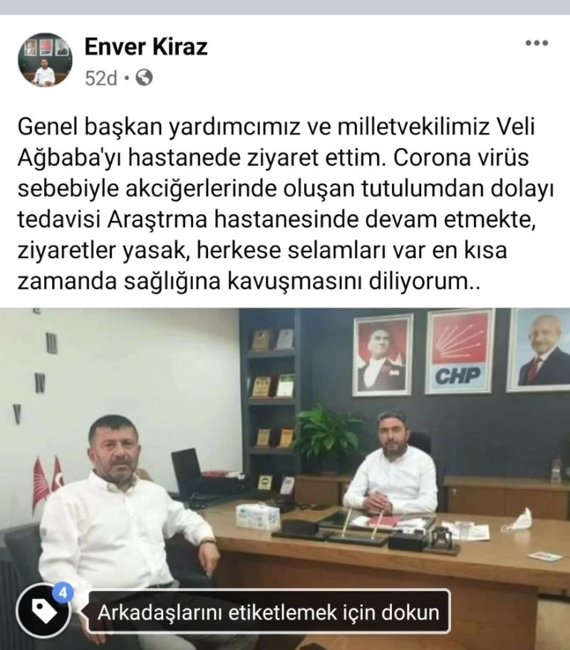 Diğer yandan, CHP Malatya İl Başkanı Enver Kiraz sosyal medya hesabından yaptığı açıklamada, "Genel Başkan Yardımcımız ve milletvekilimiz Veli Ağbaba’yı hastanede ziyaret ettim. Kovid-19 nedeniyle akciğerlerinde oluşan tutulumdan dolayı tedavisi hastanede devam ediyor. Ziyaretler yasak, herkese selamları var en kısa zamanda sağlığına kavuşmasını diliyorum" dedi.