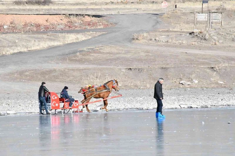 Ardahan’da dondurucu soğukların etkisiyle yüzeyi buzla kaplanan Çıldır Gölü buz pateni yapanların uğrak yeri oldu.