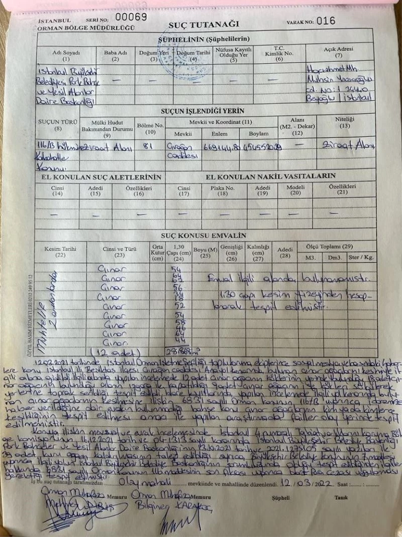 İstanbul Orman Bölge Müdürlüğü, Beşiktaş’taki tarihi çınarları kesen İBB’ye 4 bin 274 lira idari para cezası kesti. Ceza tutanağında kesim işlemi için bölge müdürlüğüne haber verilmediği yer aldı.