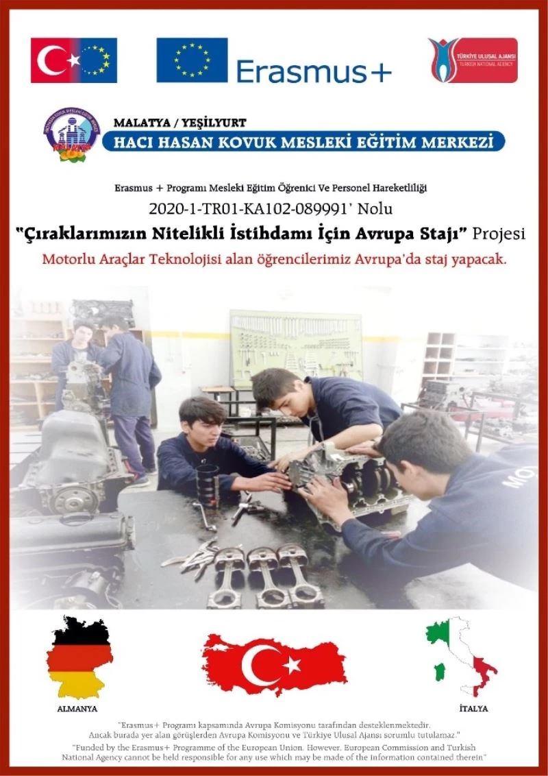 Avrupa Birliği Eğitim ve Gençlik Programları Merkezi Başkanlığı Erasmus- Mesleki Eğitim Programı Hareketlilik Programı kapsamında Malatya Hacı Hasan Kovuk Mesleki Eğitim Merkezi Müdürlüğü’nün “Çıraklarımızın Nitelikli İstihdamı İçin Avrupa Stajı” adlı projesi kabul edildi. Hacı Hasan Kovuk Mesleki Eğitim Merkezi Müdürü Remzi Sevim, öğrencilerin deneyimlerinin attırması bakamından Avrupa’da staj yapmalarının önemli olduğunu belirtti. Sevim, proje ile ilgili olarak “Motorlu Araçlar Teknolojisi alanında okuyan 20 öğrenci refakatçı öğretmenlerle beraber İtalya ve Almanya’ya giderek staj yapacaklar. Oto tamir ve bakım servislerinde mesleki becerilerini geliştirme imkanı yakalayacaklar. Öğrencilerimiz alanlarında yapacakları staj ile Avrupa’da kullanılan ileri teknolojileri, yenilikleri, yöntemleri ve uygulamaları yerinde görmeleri, bilgi almaları, uygulamalara katılarak deneyim edinmeleri, pratiklerini arttırmaları ve mesleki becerilerini geliştirmeleri bakımından Avrupa stajı önemlidir. Yabancı dil becerilerini geliştirerek farklı kültürleri tanımaları hedeflemektedir. Öğrencilerin proje ile edindikleri bilgi ve deneyimleri öğrendikleri yeni yöntem ve iyi uygulamaları ülkemize transfer ederek okullarda ve işletmelerde uygulamaları, yaygınlaştırma faaliyetleri ile bölgemiz ve ülkemizdeki meslektaşları ve sektörle paylaşmaları amaçlanmaktadır” açıklamasında bulundu.
