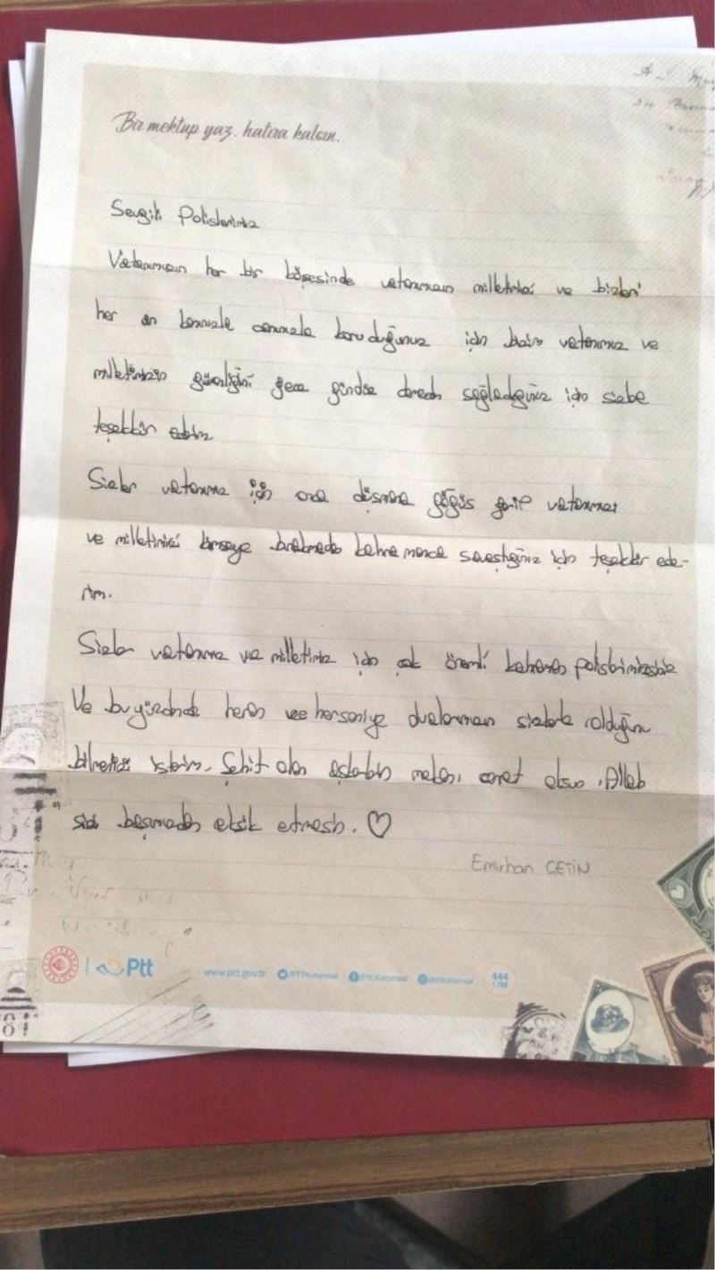 Afyonkarahisar’ın Basmakçı ilçesinde Atatürk Ortaokulunda eğitim gören 8’inci sınıf öğrencisi Emirhan Çetin, Doğu ve Güneydoğuda terörle mücadele eden güvenlik güçlerinin yapmış olduğu zorlu görevden etkilenerek polislere hem teşekkür etmek hem de yapmış oldukları görevin ne kadar kahramanca bir görev olduğunu ifade etmek amacıyla duygusal bir mektup yazdı.