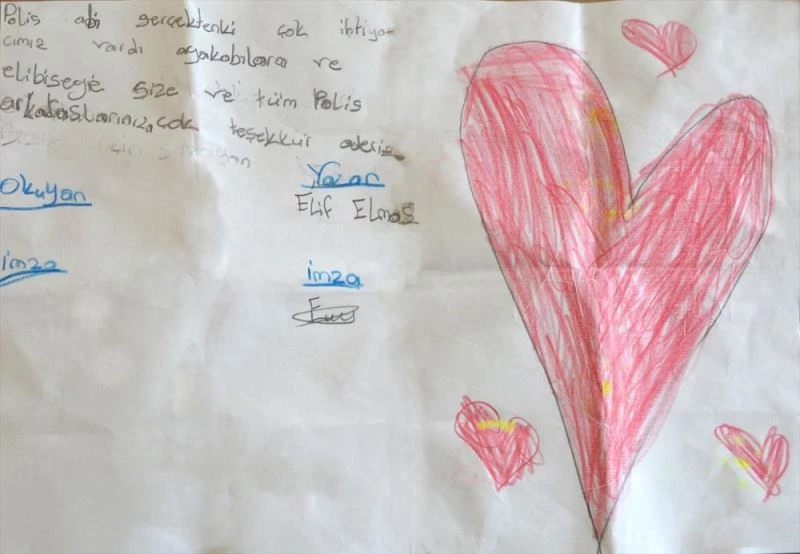 Elif Elmas ismindeki bir çocugun kalp resimleriyle süsledigi mektubunda, "Polis agabey, gerçekten çok ihtiyacimiz vardi ayakkabilara ve elbiseye. Size ve tüm polis arkadaslariniza çok tesekkür ederiz." ifadeleri yer aldi.
