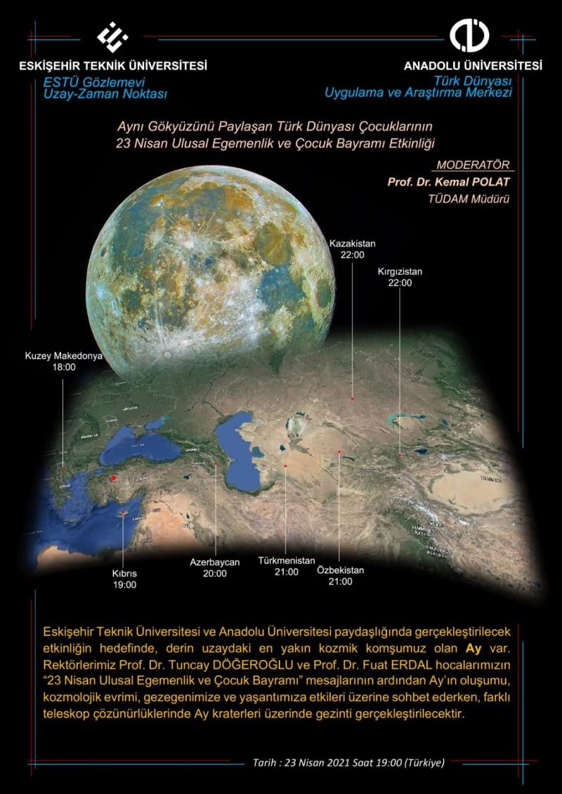 Eskişehir Teknik Üniversitesi ve Anadolu Üniversitesi paydaşlığında gerçekleştirilecek olan etkinlikte; Türkiye, Kuzey Makedonya, Kıbrıs, Azerbaycan, Türkmenistan, Özbekistan, Kırgızistan ve Kazakistan’da aynı gökyüzünü paylaşan Türk Dünyası çocukları, Türkiye saatiyle 19:00’da sanal platformda bir araya gelecek. “101. Yıl Gökyüzü Paydaşlığı: Hedef Ay” başlıklı etkinliğin moderatörlüğünü Anadolu Üniversitesi Türk Dünyası Uygulama ve Araştırma Merkezi (TÜDAM) Müdürü Prof. Dr. Kemal Polat’ın yapacak. Etkinliğe, Eskişehir Teknik Üniversitesi Rektörü Prof. Dr. Tuncay Döğreroğlu ve Anadolu Üniversitesi Rektörü Prof. Dr. Fuat Erdal da 23 Nisan Ulusal Egemenlik ve Çocuk Bayramı mesajları ile katılacak.