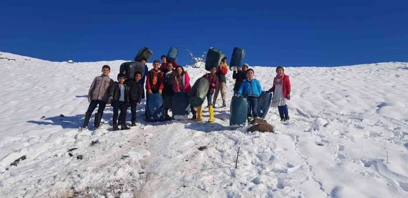 Hakkari’nin Derecik ilçesine bağlı Koryürek köyündeki çocuklar, evlerinden getirdikleri su bidonlarıyla kayma keyfi yaşadı.