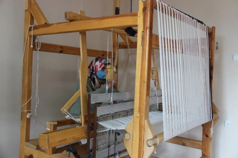 Erzurum’un Aziziye ilçesi Organize Sanayi Bölgesi’nde kurulan ’Aziziye El Sanatları Üretim İşletmesi’nde kadınlar kendi elleriyle tezgahlarda ehram örüyor.