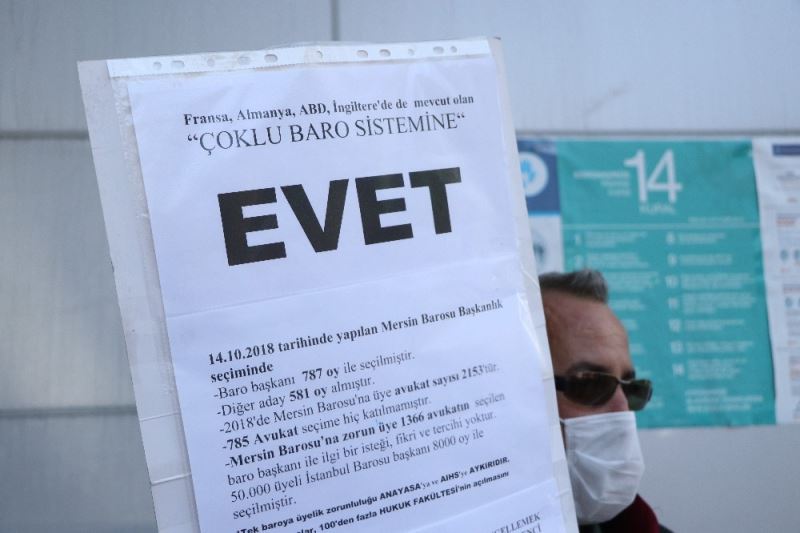 Son günlerde gündem olan ’çoklu baro sistemi’ ile ilgili tartışmalar sürerken, Mersin’de bir avukat sistemin gelmesi için tek başına eylem yaptı. Mersin Adalet Sarayı bahçesinde ’çoklu baro sistemine evet’ yazılı pankartla eylem yapan avukat İzzet Yıldırım, sistemin Türkiye’de uygulanmasını istedi.