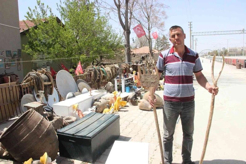 Karaman’ın Kazımkarabekir ilçesinde hurdacılık işiyle uğraşan Halit Ordu, çöplerden ve satın alarak topladığı eski tarım aletlerini kiraladığı evin önünde ve bahçesinde sergiliyor.