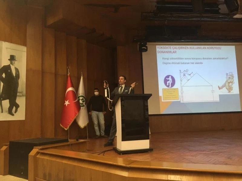Prof. Dr. Mithat Özsan Amfisi’nde düzenlenen eğitim programında, iş güvenliği uzmanı Necati Ulaştırıcı tarafından yüksekten düşmenin dinamiği, merdiven, iskele, platformlarda güvenli çalışma ve çalışanlara olası risklerin önüne geçilmesi için alınması gereken tedbirler aktarıldı.