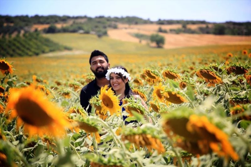 Bazı çiftler de düğün öncesi veya hamilelik fotoğraf çekimini, ayçiçeği tarlalarında yaptırıyor.