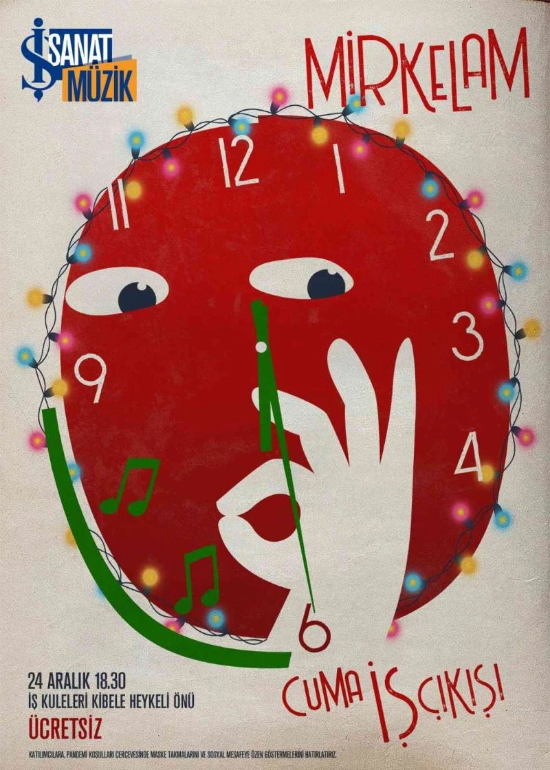 Haftanın yorgunluğunu müzik eşliğinde atmak isteyenler için bir buluşma noktası olan İş Sanat Cuma İş Çıkışı yeni yıl özel konserinde Mirkelam sahne alacak. 24 Aralık Cuma saat 18.30’da Kibele Çeşmesi Heykeli önünde DJ Herman’s performansıyla başlayacak ücretsiz etkinlik, 19.00’da Mirkelam konseri ile devam edecek.