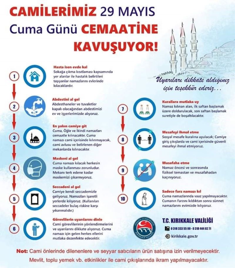 Korona virüsü salgını tedbirleri kapsamında bir süredir kapalı olan ve cemaatle namaz kılınması yasak olan camiler, 29 Mayıs Cuma günü tekrar ibadete açılacak. Namaz cemaatle birlikte sosyal mesafe kurallarına uyarak cami avlusunda ve belirlenen spor salonu, pazar yeri gibi alanda açık havada kılınacak. Salgın nedeniyle namaz öncesi, namaz sırası ve sonrasında birçok yeni kural uygulanacak. Kırıkkale Valiliği de, Cuma namazı kılınacak alanlarda uyulması gereken kuralları açıkladı.