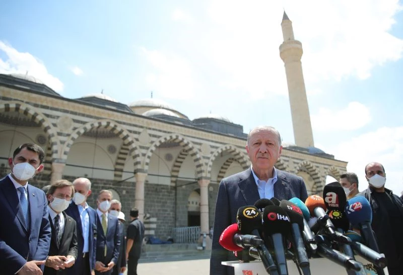 Cumhurbaşkanı Recep Tayyip Erdoğan bugün sadece Diyarbakır’ı ziyarete gelmediğini söyledi. Cumhurbaşkanı Erdoğan, "Kardeşlerim burada öncelikle bir hususu açıklığa kavuşturmakta fayda görüyorum. Biz bugün Diyarbakır’a sadece açılış ve ziyaret yapmak için gelmedik. Biz bugün buraya aynı zamanda Diyarbakır’ı dinlemek, Diyarbakırlılarla istişare etmek, Diyarbakırlı olan kardeşlerimizle kalplerimizi birleştirmek için geldik. Sizlerin görüşlerine, sizlerin değerlendirmelerine ve fikirlere büyük önem veriyorum. Diyarbakır il başkanımıza ve il yönetimimize bizlere böyle bir imkan sundukları için teşekkür ediyorum. Kesinleşmiş il danışma toplantımızın partimiz ve teşkilatımız için hayırlara vesile olmasını Rabbimden niyaz ediyorum. Sizlerin şahsında şehre geldiğimiz andan itibaren bize büyük bir teveccüh gösteren tüm Diyarbakırlı vatandaşlarıma şükranlarımı sunuyorum. Bu zorlu yolculuğumuzda dava arkadaşlarımızdan vefat edenler olduğu gibi bölücü terör örgütü tarafından kalleşçe şehit edilenler de var. Diyarbakır eski gençlik kolları başkanımız Yunus Koca. 31 Ağustos 2015 tarihinde iş yerinde, Dicle ilçe başkanımız Deryan Akterk 10 Ekim 2016 tarihinde iş yerinde. Lice başkan yardımcımız Orhan Mercan, 30 Haziran 2017 tarihinde evinin ve evlatlarının gözü önünde hainler tarafından alçakça şehit edildi. Gerek terörle mücadele sırasında gerekse millet ve memleket yolunda siyaset yaparken şehit düşen tüm kahramanları rahmetle yad ediyorum. Rabbim şehitlerimizin ruhlarını şad, makamlarını âli, mekanlarını cennet eylesin. Biz onların samimiyetine gayretine yine şahidiz. Gençler Rabbimiz ayetinde ne buyuruyor? Allah yolunda öldürülenlere ölüler demeyiniz, onlar diridirler ancak siz bilemezsiniz. Şimdi bu gençler, bu kardeşlerimiz. Allah yolunda öldüler. Millet ve ümmet için çarpan yüreklerin büyüklüğüne şahit. Rabbim de onları fedakarlıkların karşılığı olarak Rasul-i Ekrem Aleyhissalâtü vesselâm efendimize komşu eylesin. Bizleri de son nefesimize kadar şehitlerimizin kutlu yolundan sıratı mustakimden ayırmasın. Şehitlerimizin kanları pahasına bize emanet ettiği sancağı namusumuz bilip biz de canımız pahasına koruyacağız inşallah daha da yücelteceğiz" şeklinde konuştu.