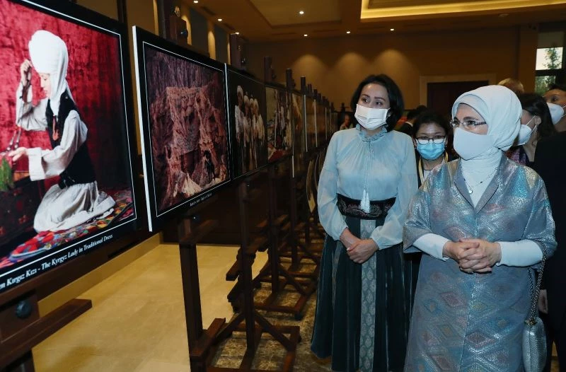Erdoğan ve Caparov, Cengiz Aytmatov Uluslararası 4. ISSIK-Göl Forumu bünyesinde açılan sergiyi de eşleri ile birlikte gezdi.