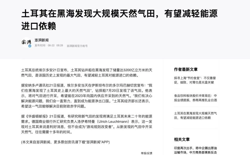 Jiemian Xinwen haber portalında yer alan haberde ise Enerji Bakanı Fatih Dönmez’in Karadeniz’deki doğal gaz keşfi ile ilgili açıklamalarına yer verildi. Haberde, Bakan Dönmez’in yeni doğal gaz rezervinin ekonomik değerinin 65 milyar dolar olduğunu açıkladığı ifade edildi.
