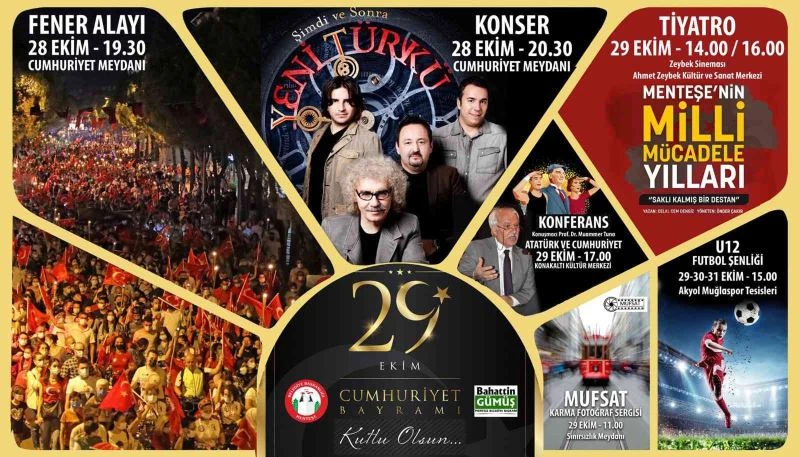 Cumhuriyet Bayramı kutlamaları, 28 Ekim Perşembe günü Cumhuriyet Meydanında Fener Alayı ile başlayacak. Fener alayının ardından açık hava konseri ile ilk gün tamamlanacak. 29 Ekim Cuma günü saat: 14.00’de Zeybek Sineması - Ahmet Zeybek Kültür ve Sanat Merkezi’nde yapılacak ‘Menteşe’nin Milli Mücadele Yılları- Saklı Kalmış Bir Destan’ adlı tiyatro oyunu sahnelenecek. Aynı gün Konakaltı İskender Alper Kültür Merkezi’nde ‘Atatürk ve Cumhuriyet’ konulu bir konferans ve etkinlikler kapsamında MUFSAT Sınırsızlık Meydanında açacağı ‘Karma Fotoğraf Sergisi’ ile fotoğraf severlerle buluşacak.